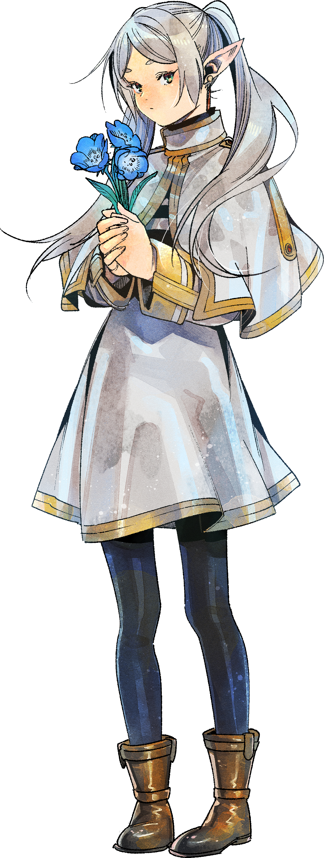 Frieren typically wears a striped black-and-white shirt, along with a white jacket tucked into a skirt with a black belt. The sleeves of her jacket end with large, gold cuffs. Both her jacket and skirt have gold trims along the edges. Over her jacket, she wears a short cape that matches the white and gold theme of her jacket and skirt, and the cape includes decorative, gold accents with red jewels on each shoulder and a high collar that is fastened with a red jewel. She also wears black tights, brown boots, and a pair of gold earrings with red, teardrop-shaped jewels hanging from each earring.